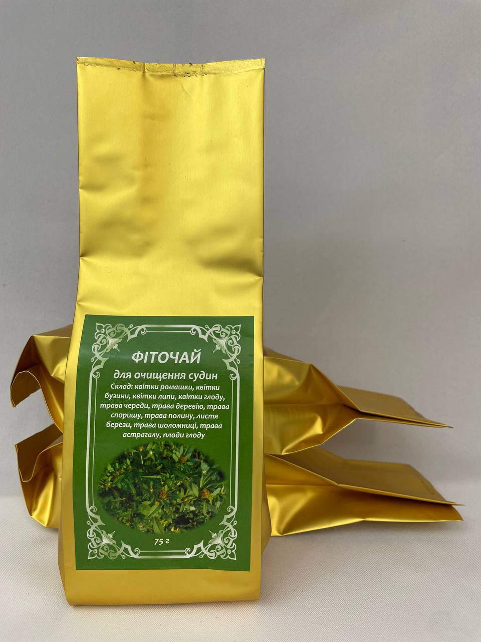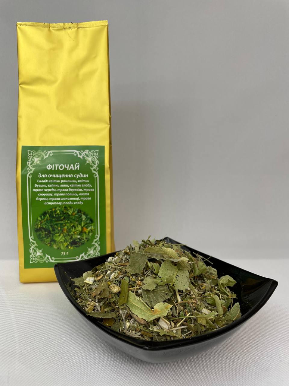 Фіточай “Для очищення судин” рекомендовано вживати для очищення судин від шлаків. Сприяє нормалізації функціонування серцево-судинної системи та стану судин. Фіточай має виражену протизапальну, антибактеріальну, сечогінну дію; сприяє зменшенню набряків, очищенню організму від токсинів; сприяє нормалізації кров’яного тиску.
