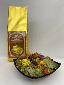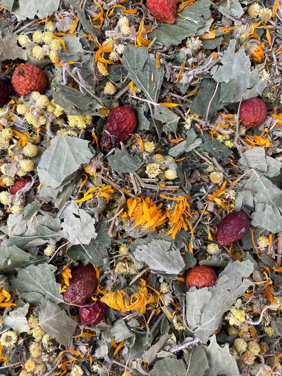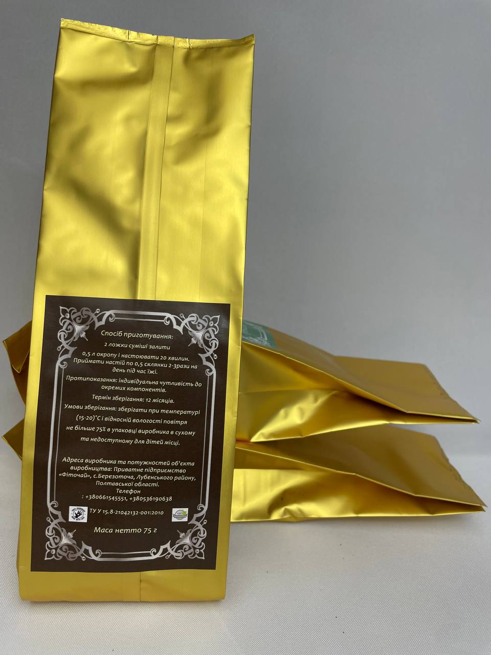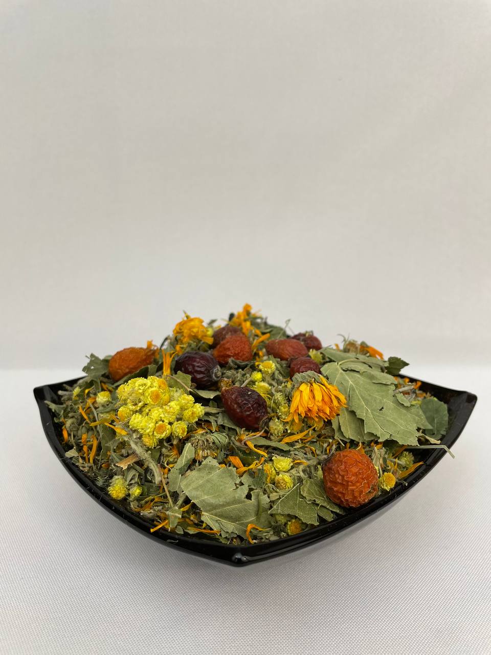 Склад: квітки цмину, квітки календули, трава парила, плоди шипшини, листя кропиви, трава звіробою, трава споришу.