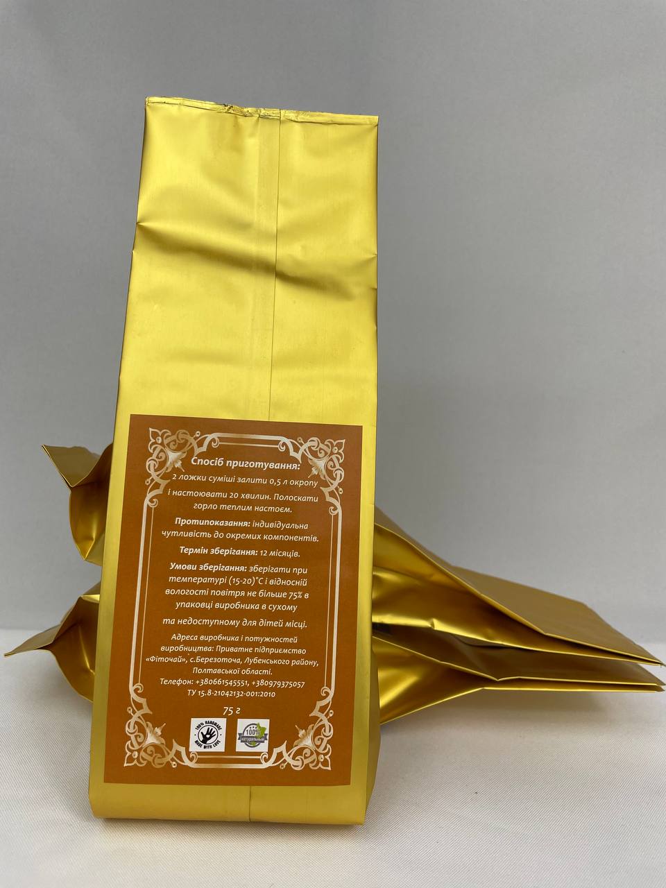 Фітозбір “Для горла” має антибактеріальну, протизапальну дію та протидіє інфекціям дихальних шляхів, оздоровлює та підвищує імунітет. Його можна застосовувати як у формі чаю, так і у формі ополіскувача для горла. Використовувати впродовж 30 днів. Курс можна повторювати.