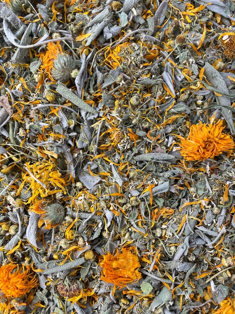 Склад: листя шавлії, трава ехінацеї, квітки ромашки, квітки нагідок.